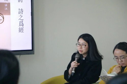 分享会首先由3位20级学生进行自我介绍并分享各自的读书心得。分享人黄欣围绕《诗经选》中的风俗习惯、古今异义进行了分析并提出疑惑之处;分享人田宇捷仔细阅读了《诗经析读》,结合作者的看法并联系当今现实社会表达了自己的观点,提出了自己的困惑;分享人李靖雯则从《诗经析读》和《诗经译注》的内容出发,具体解读了书中的几章诗篇,分享了自己独特的感悟。接着指导老师沈扬、孙慧琦、王风丽发表了各自对《诗经》独到的见解,总结了书中的精华之处并为同学们解疑答惑。最后现场几位新生对《诗经》中不懂的问题进行提问,由3位指导老师进行解答。