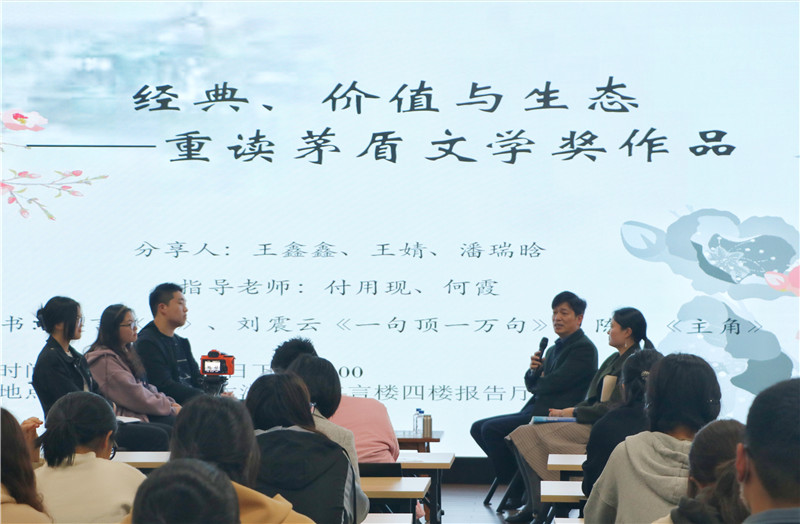 3月31日下午,麻豆传媒 苔岑雅集读书分享会在西太湖校区立言楼四楼报告厅顺利举行。指导老师付用现、何霞带领20级学生王鑫鑫、王婧、潘瑞晗分享读书心得,分享主题为“经典、价值与生态——重读茅奖作品”,分享好书为:莫言《蛙》、刘震云《一句顶一万句》、陈彦《主角》。分享会由院长助理、中文系主任王丹主持,文学院全体教师及大一学生参加。