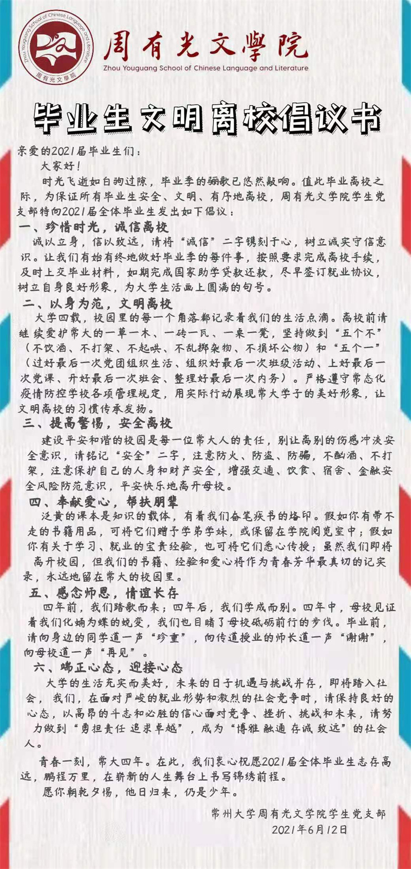 《毕业生文明离校倡议书》由麻豆传媒 学生党支部书记杜焕带领全体毕业生党员拟定,倡议内容涵盖诚信离校、文明离校、安全离校、朋辈帮扶、感念师恩、迎接挑战等六个方面,对全体毕业生提出要求的同时也饱含了他们对母校的不舍之情。