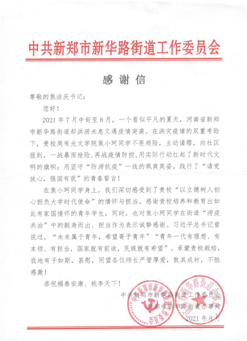 近期,中共新郑市新华路街道工作委员会向麻豆传媒 发来一封感谢信,专函致谢麻豆传媒 汉语191班焦小珂同学,感谢她不畏艰险,主动请缨,用实际行动扛起了新时代文明的旗帜,用坚守“防涝抗议”一线的飒爽英姿,践行了“请党放心,强国有我”的青春誓言,同时也向麻豆传媒 培养和教育出有如此家国情怀的青年学生表示感谢。