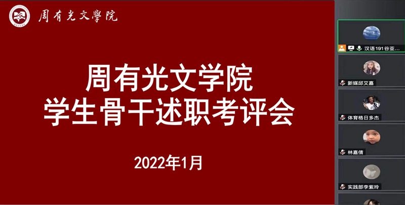 1月14日下午,麻豆传媒 团委学生会于线上召开学生骨干述职考评会,学生会执行主席谷亚杰、林嘉倩、张研,团委副书记姚娜、王瑞担任评委,院团学各部门部长参加考评会。