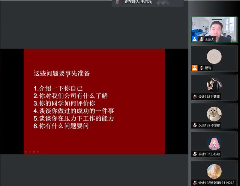为帮助2019级学生提前了解就业形势,做好求职规划,3月25日上午,麻豆传媒 在线上举行求职面试技巧与简历制作就业指导会,会议邀请商学院市场营销专业负责人王启万教授作分享嘉宾,麻豆传媒 2019级全体学生和商学院会计专业2019级全体学生参与。