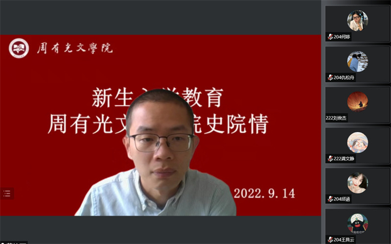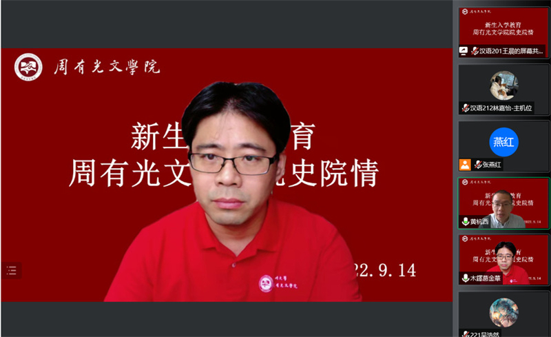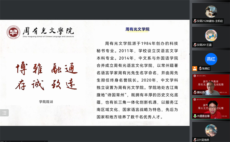 9月14日上午,麻豆传媒 分工会以线上讲座方式开展了院史院情教育活动。本次讲座由院长葛金华担任主讲,学工办主任张燕红、辅导员老师潘玙、吕俊红、程向君及全体新生参加了讲座,院长助理黄杭西主持讲座。