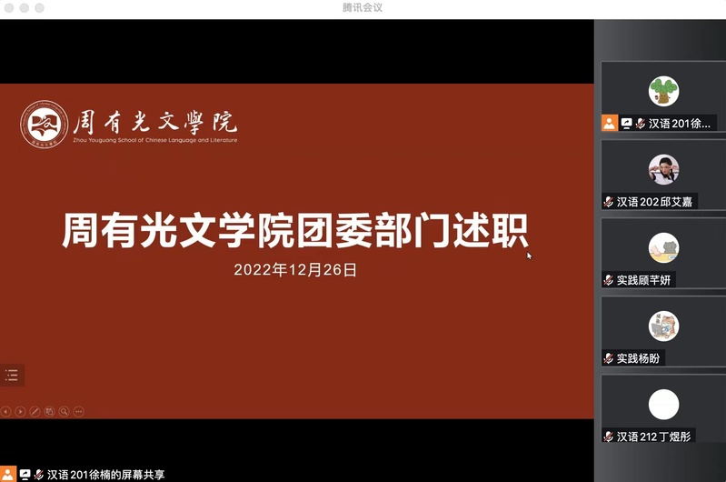 12月26日下午,麻豆传媒 团委于线上召开年终述职。会议由团委副书记徐楠主持,麻豆传媒 团工作负责人吕俊红、团委副书记邱艾嘉及团委全体成员出席了本次会议。