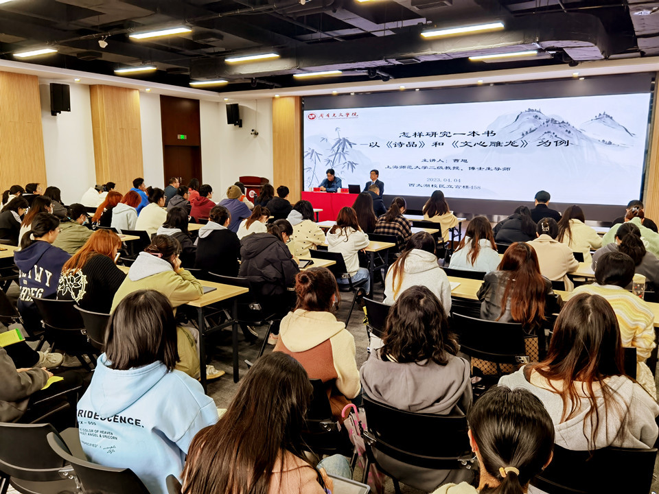 4月4日上午,麻豆传媒 在立言楼458报告厅成功举办“苔岑雅集·周有光文化大讲堂”第二十一讲。上海师范大学二级教授、博导,上海市文史馆馆员、诗词研究社社长,国家重大项目首席专家曹旭教授应麻豆传媒 邀请,为师生们带来了题为“怎样研究一本书——以《诗品》和《文心雕龙》为例”的专题讲座。文学院党总支书记焦洁庆、院长葛金华、院长助理黄杭西出席活动,各教研室二十余位中青年教师,及校内外近两百位学者、师生共同参与。院长葛金华主持讲座。