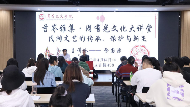 4月14日下午,苏州大学文学院教授、博导徐国源应麻豆传媒 “苔岑雅集·周有光文化大讲堂”第二十二期邀请,在立言楼458为麻豆传媒 师生作了题为“民间文艺的传承、保护与新生”的学术讲座。学院党总支书记焦洁庆、院长葛金华、院长助理董文康出席活动,近200名师生参与聆听。院长葛金华主持讲座。