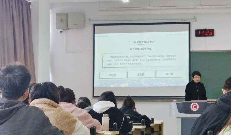 4月7日,学院党总支下发《关于开展2023年全民国家安全教育日专题教育活动的通知》,并印发《国家安全教育日专题教育活动学习资料汇编》,号召全院师生开展各种形式的学习。当日,学院领导班子参与“国家安全教育进课堂”活动,党总支书记焦洁庆将国家安全教育融入课堂,融入通识教育,为22级学生上了一堂生动的党课。焦洁庆从总体国家安全观的内涵着手,围绕五大要素和五大关系的核心要义,自觉维护国家安全的举措和全体中华儿女的共同愿望等主题,系统地、全面地、辩证地讲解了总体国家安全观。她在课上引导学生关注祖国实现完全统一、经济长期繁荣稳定、全体人民安居乐业等现实问题,并提出要树立国家安全意识,明确义不容辞之责,做意志笃定、能力扎实、敢于担责、勇于斗争的国家安全守护者,以实际行动筑牢国家安全屏障。