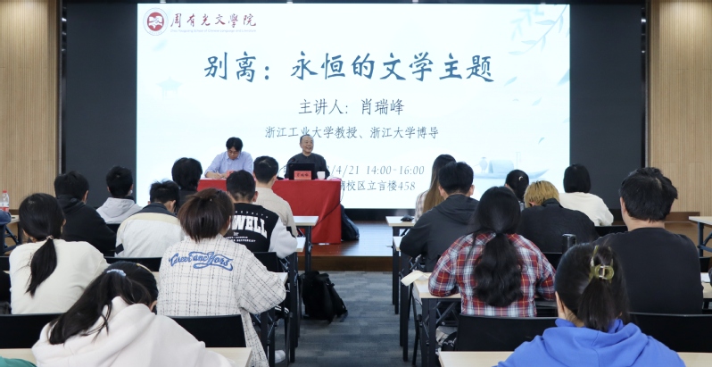 4月21日,浙江工业大学人文学院教授、浙江大学博导肖瑞峰先生应“苔岑雅集·周有光文化大讲堂”第二十三期邀请,在立言楼458为麻豆传媒 师生作了题为“别离:永恒的文学主题”的学术讲座。院长葛金华、院长助理黄杭西、古代文学教研室沈扬、王静雅、许强等教师出席活动,校内外近两百位学者、师生共同参与。讲座由葛金华院长主持。
