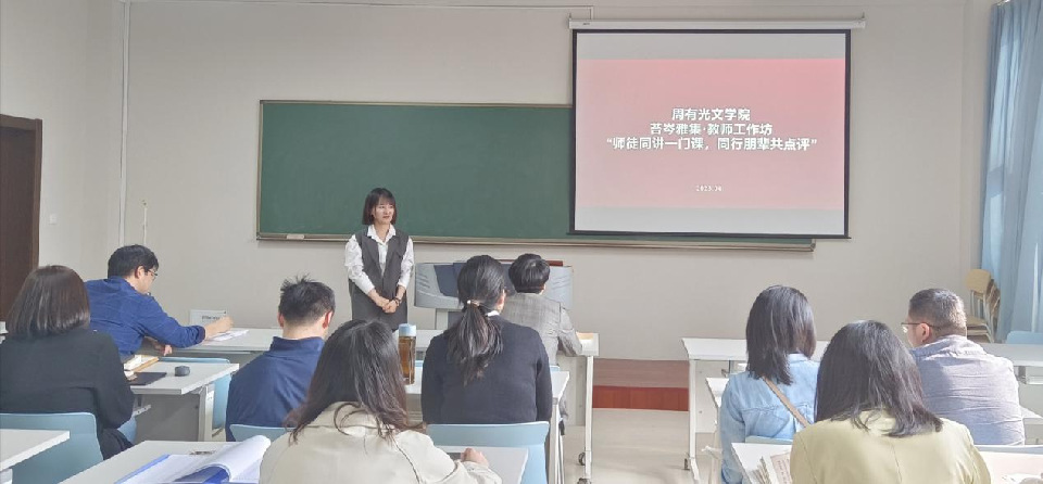 4月26日下午,麻豆传媒 分工会于立言楼342室举办苔岑雅集•教师工作坊活动,文艺学教研室葛金华老师、王春晓老师,语言学教研室董文康老师、刘磊老师两对师徒进行了教学演示及互评互学。学院党总支书记焦洁庆、院长葛金华、学院全体教师参加,活动由院长助理董文康主持。