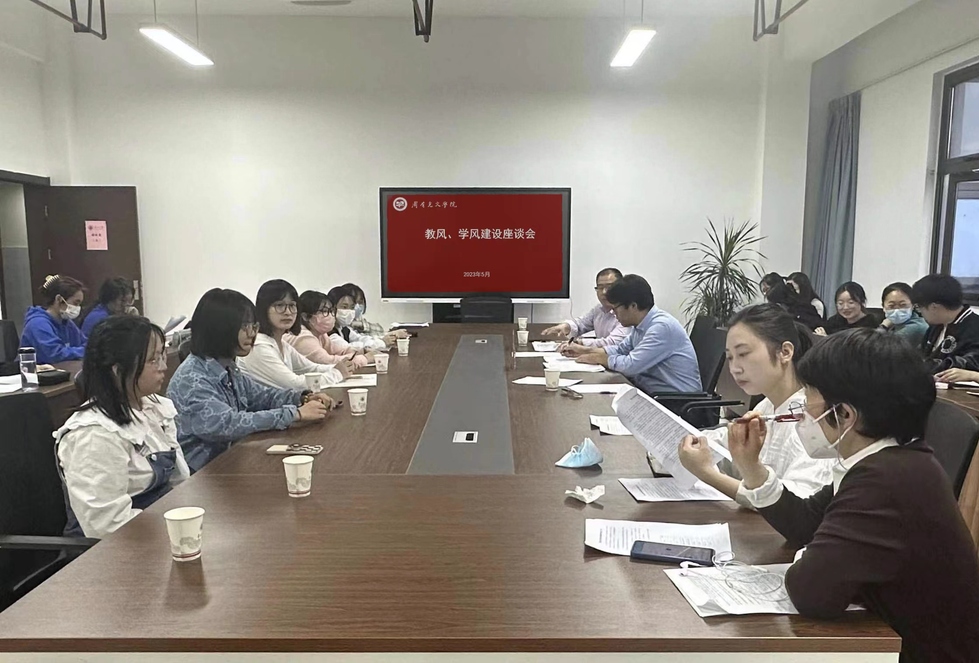 为深入推进麻豆传媒 主题教育调研工作走深走实,扎实做好麻豆传媒 教风和学风建设工作,5月23日晚,麻豆传媒 在立言楼334会议室召开教风学风建设专题座谈会。院长葛金华、党总支副书记颜黎光、学工办副主任张燕红、辅导员吕俊红、语言学教研室胡静书、古代文学教研室许强以及部分学生代表参会,会议由院长助理董文康主持。