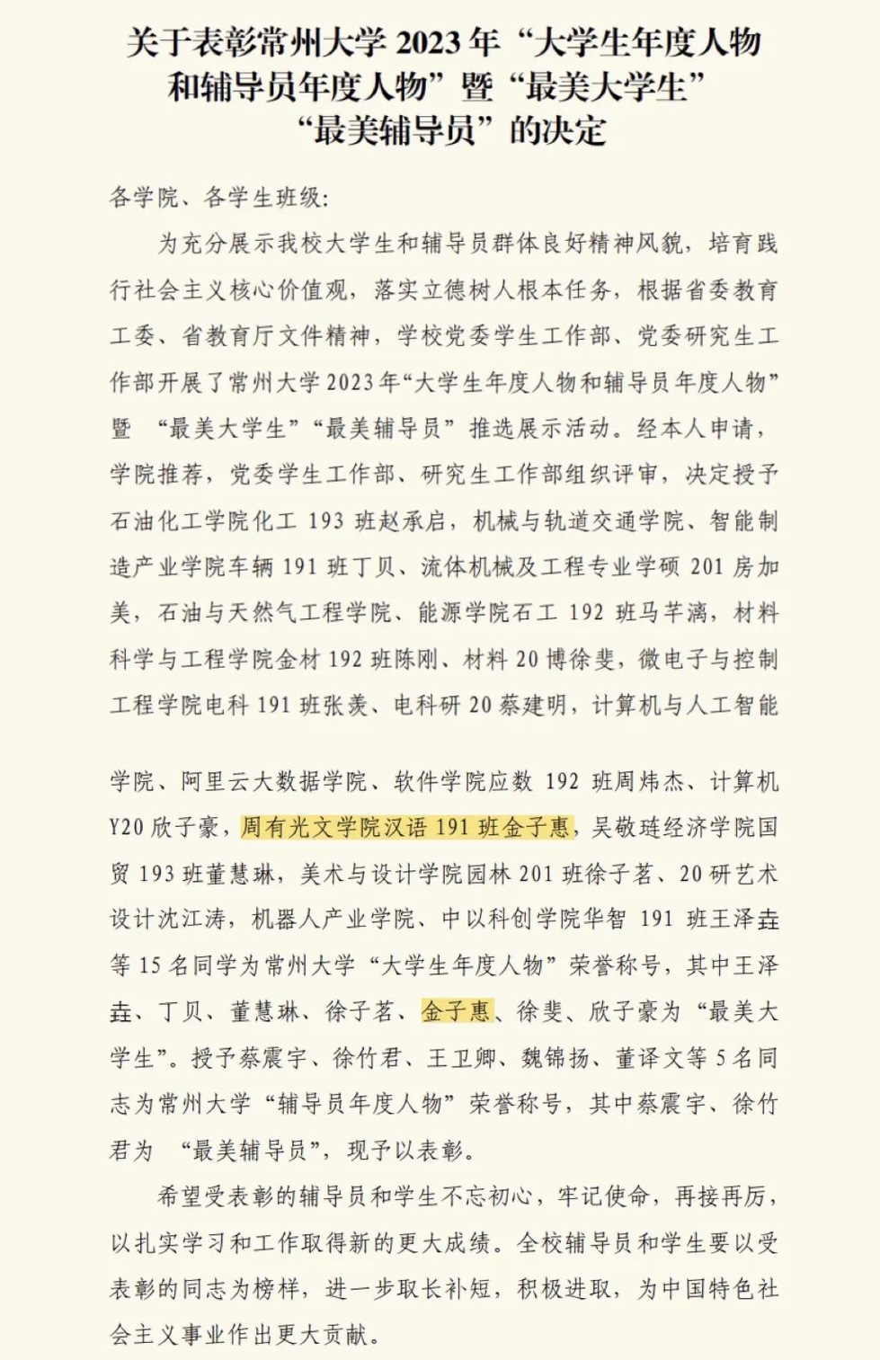 近日,学校党委学生工作部、党委研究生工作部公布了《关于表彰麻豆传媒 2023年“大学生年度人物和辅导员年度人物”暨“最美大学生”“最美辅导员”的决定》,麻豆传媒 金子惠被授予2023年麻豆传媒 “大学生年度人物”暨“最美大学生”荣誉称号。