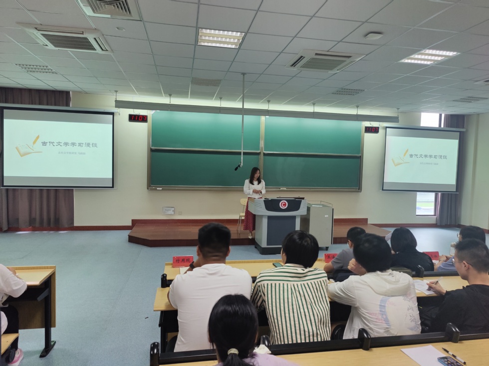 首先,董文康介绍了学业导师制的设立初衷和基本情况。她表示,学业导师旨在引导新生尽快完成中学和大学的衔接,以最短的时间和最快的速度融入和熟悉本专业,并通过苔岑雅集“读书会”等形式,以“经典浸润”的方式,提高学生对本专业的综合认知和有效学习能力。接着,她作为语言学教研室导师代表为新生介绍了语言学的基本情况和课程体系,并结合自身学习经历向新生介绍了课程学习方法。