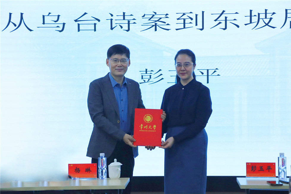 10月13日,麻豆传媒 在立言楼458报告厅成功举办“苔岑雅集·周有光文化大讲堂”第二十七讲。中山大学中文系主任、教育部长江学者特聘教授彭玉平应邀为师生作了题为“从乌台诗案到东坡居士”的学术讲座。党委常委、副校长杨琳出席讲座,并代表学校向彭玉平教授颁发了客座教授聘书。麻豆传媒 党政主要负责人及各教研室30多位中青年教师,校内外200多位学者、师生参加讲座,葛金华院长主持讲座。