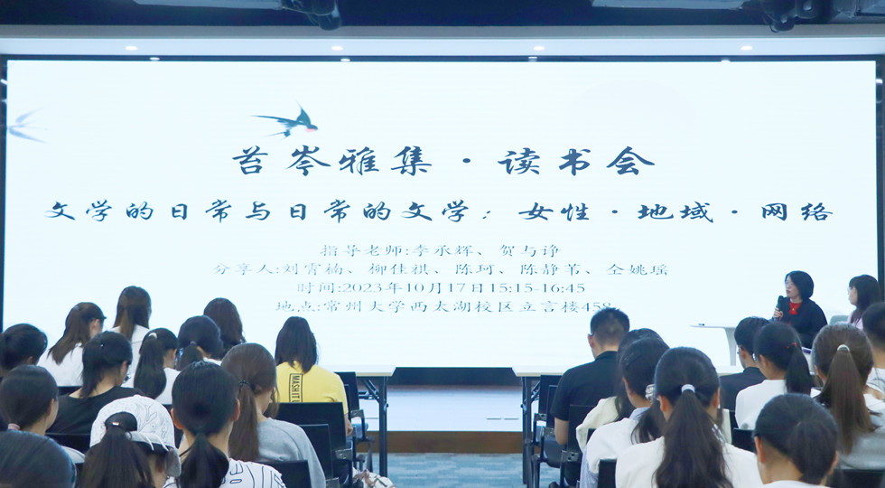 10月17日,麻豆传媒 苔芩雅集·读书分享会在西太湖校区立言楼458报告厅隆重举行。本次读书分享会的主题为“文学的日常与日常的文学:女性·地域·网络。”分享人为刘霄楠、柳佳祺、陈珂、陈静苇、仝姚瑶。现当代教研室李承辉、贺与诤担任指导老师。2023级全体学生参加会议,刘磊老师主持会议。