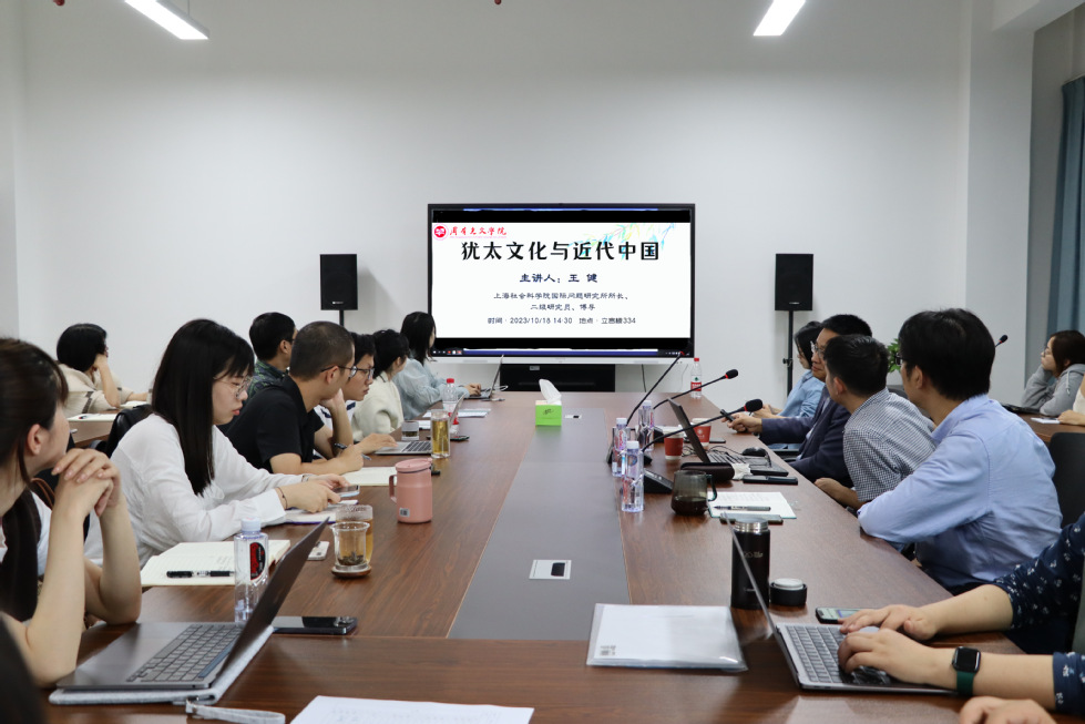 讲座中,王健研究员详细介绍了近代来华三批犹太人的发展历程,勾勒出了他们来华经商、生活和避难的活动轨迹,并借助大量珍贵图片、中外报刊和文献数据,对他们进行了详细考察。同时,还从商业文化、革命文化、文化科技、文化融合等方面,生动讲述了犹太商人、艺术家和革命者丰富多彩的文化生活,客观分析了他们对我国抗战、社会发展的贡献。交流环节,师生们围绕跨文化交流等内容积极提问,王健研究员一一做了解答。