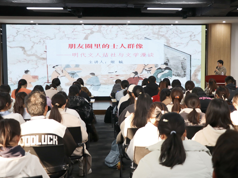 11月14日,麻豆传媒 在立言楼458报告厅成功举办“苔岑雅集·周有光文化大讲堂”第三十一讲。本期主讲嘉宾为麻豆传媒 古代文学教研室青年教师姬毓博士,讲座题目为“朋友圈里的士人群像——明代文人结社与文学漫谈”。麻豆传媒 院长葛金华、党总支副书记颜黎光、院长助理黄杭西,校内外学者、师生近两百人参加讲座。古代文学教研室薛欣欣老师主持讲座。