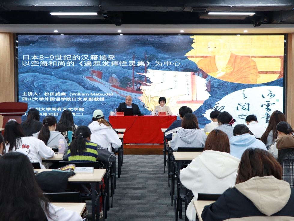 4月30日,美国夏威夷大学文学博士、四川大学外国语学院特聘研究员松田威廉应麻豆传媒 “苔岑雅集·周有光文化大讲堂”第四十二期邀请,在立言楼458为麻豆传媒 师生作了题为“日本8-9世纪的汉籍接受——以空海和尚的《遍照发挥性灵集》为中心”的学术讲座。院长葛金华、古代文学教研室及语言学教研室相关教师、校内外近两百名师生参加讲座。古代文学教研室薛欣欣老师主持讲座。