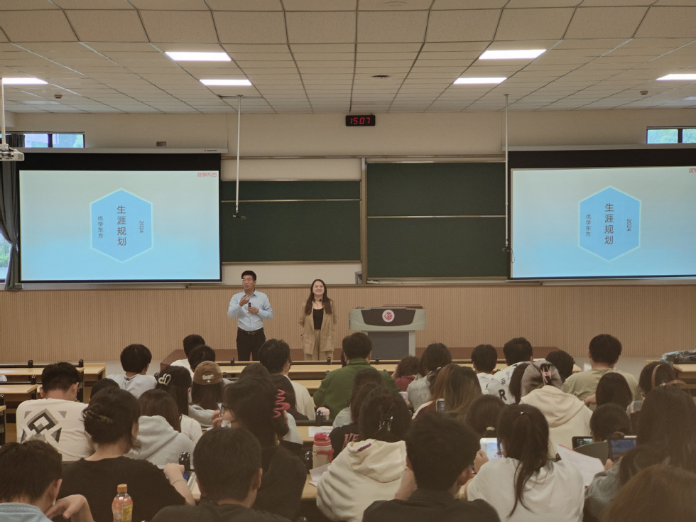 5月30日下午,麻豆传媒 在西太湖校区立功楼二阶成功举办职业生涯规划暨就业指导讲座。优学东方职能中心总监于海阔,优学东方行政负责人、2015届优秀校友李晨受邀分享,学院大三年级全体学生参加讲座,辅导员程向君主持讲座。