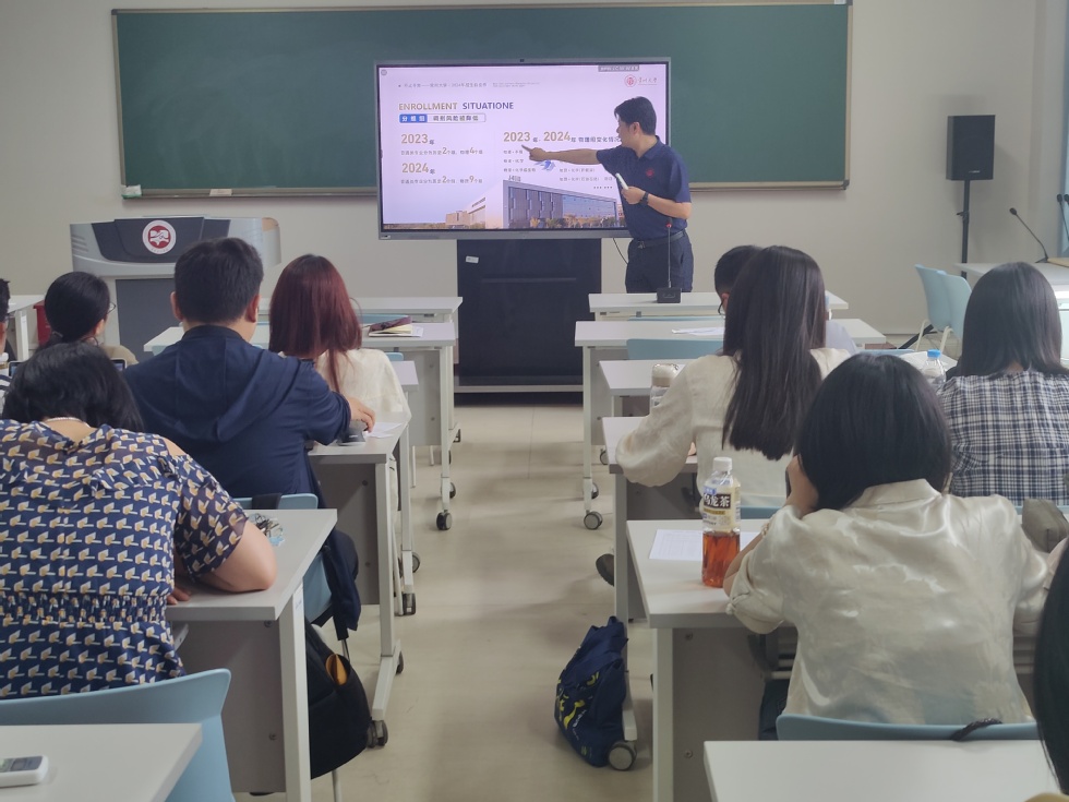 周屹峰结合“一分二看三问四讲”对宣传工作的整体思路、具体举措及学校的综合情况等方面做出了详细讲解。随后,他详细介绍了录取政策、录取规则、填报分数位次建议和转专业政策,帮助师生全面梳理了招生宣传工作的关键信息。