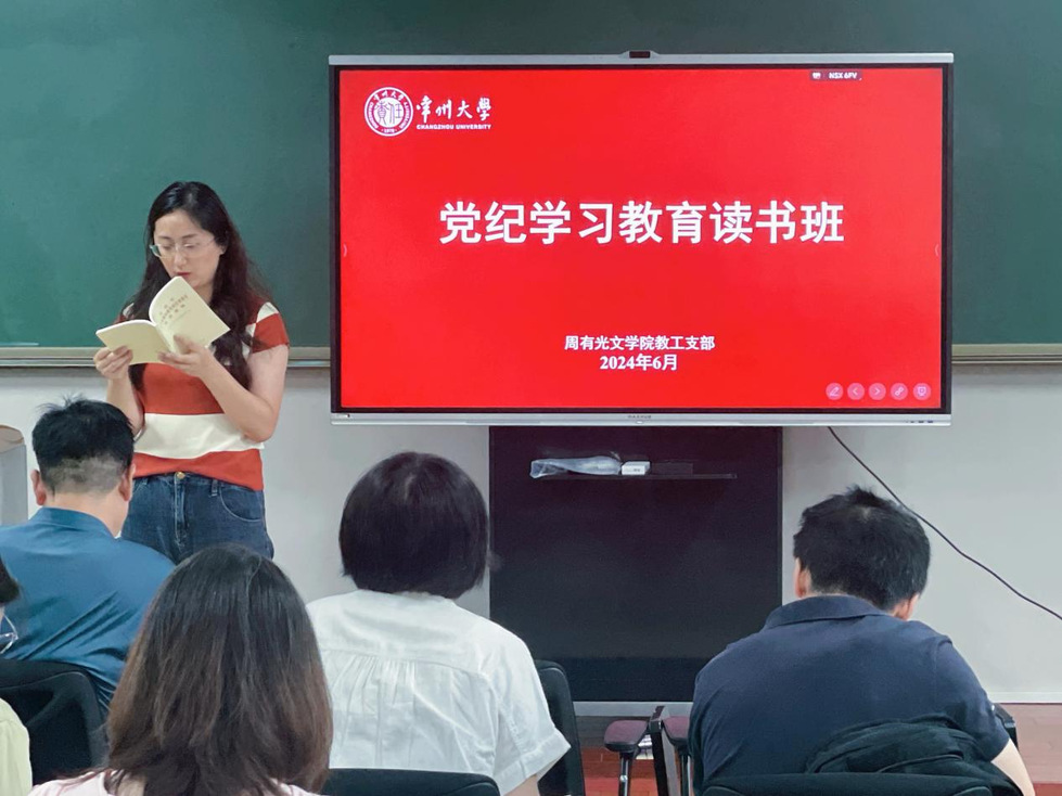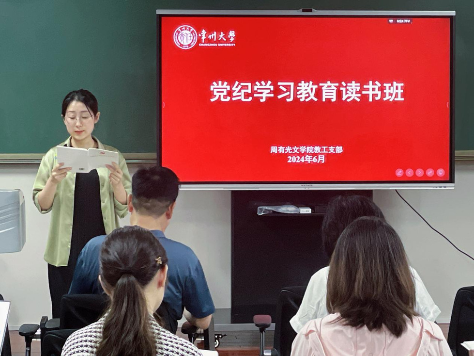 6月20日下午,麻豆传媒 教工支部于立言楼342开展党纪学习教育读书班,学习《中国共产党纪律处分条例》和《习近平关于全面加强党的纪律建设论述摘编》,并组织观看专题片《严于律己的楷模——周恩来》。学院领导班子和全体教工党员参加,会议由教工支部书记付用现主持。