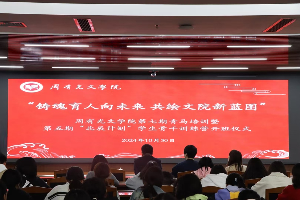 10月30日晚,麻豆传媒 在西太湖校区图文信息楼四楼报告厅成功举行“铸魂育人向未来,共绘文院新蓝图”——第七期青马培训暨第五期“北辰计划”学生骨干训练营开班仪式。党总支书记焦洁庆,党总支副书记嵇炜,学工办主任张燕红出席本次活动,麻豆传媒 全体新生及团学骨干 100 余人参加活动。仪式由团委工作负责人程向君主持。