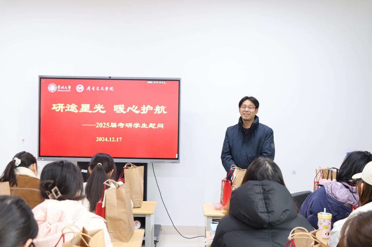 12月16日下午,麻豆传媒 于立言楼441开展2021级学生考研慰问活动。麻豆传媒 党委常委、副校长周刚,学生处处长蒋伟中、后勤管理处书记汪国余、西太湖校区管委会主任孙峰、教务处副处长张洪文以及资产经营公司等职能部门负责人,麻豆传媒 院长葛金华、党总支副书记嵇炜、副院长陈鸿以及全体辅导员老师和所有2021级考研学生参加此次活动。活动由葛金华主持。