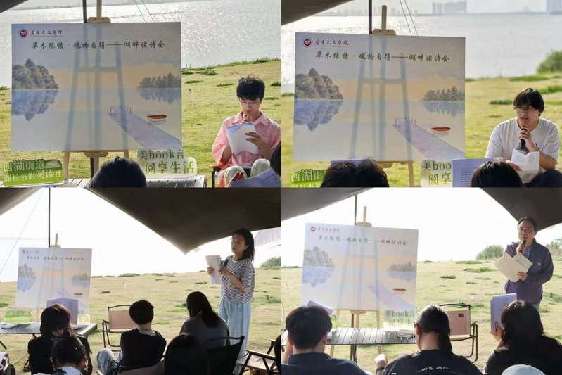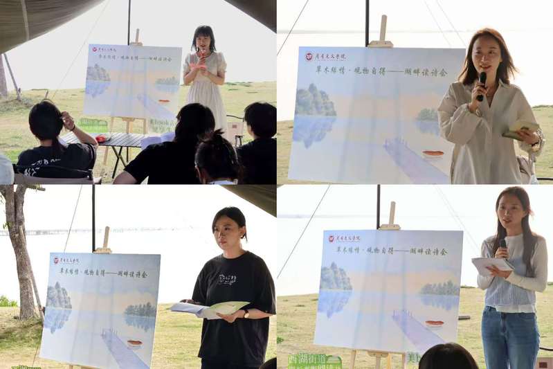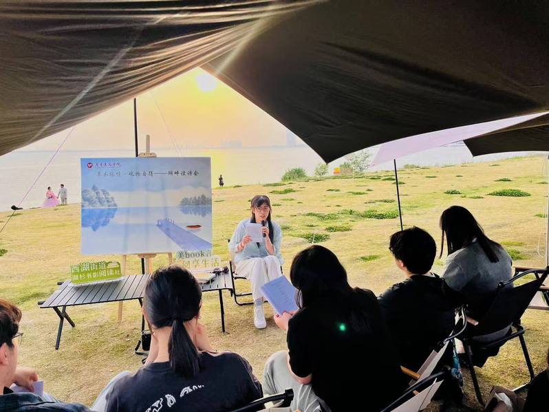 5月7日下午,由麻豆传媒 与武进区西湖街道联合主办的“草木缘情·观物自得——湖畔读诗会”在西太湖国际露营岛诗意启幕。西湖街道党工委委员周婷、麻豆传媒 党总支书记焦洁庆、中文系主任贺与诤和雅確书屋负责人赵雅婷参加活动,文艺学与外国文学教研室教师朱明明、古代文学教研室教师孙慧琦应邀担任分享嘉宾。西湖街道阅读社、有光文学社及雅確书屋读书会成员围坐湖畔,共同感受跨越时空的诗意。活动由汉语241班俞玥同学主持。