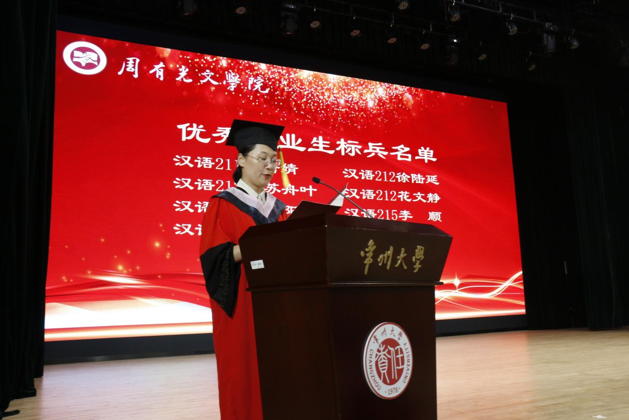 汉语211班张梦婷同学代表毕业生发言,她在发言中首先代表全体毕业生对一路相伴的良师益友表示诚挚的感谢。她回望四年来的成长经历和收获,鼓励大家调整好自己的情绪和状态,用好在校所学,深耕内心沃土,用心服务社会,实现人生价值。