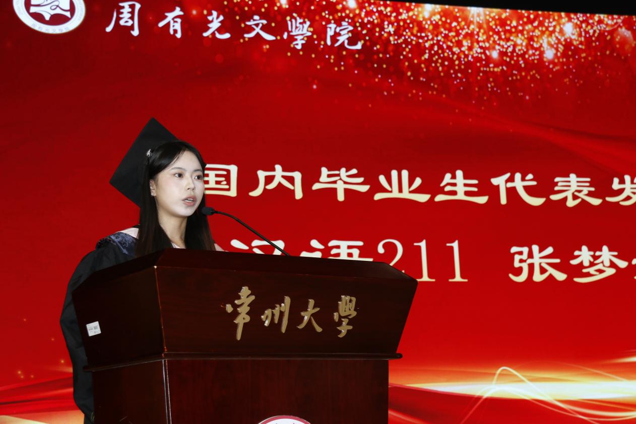 汉语213班杜黄庆心同学代表留学毕业生发言。她在发言中回顾了留学路上收获的知识与跨国情谊,感谢各位老师的悉心教导和精心栽培。她祝愿同学们永葆赤子之心,勇敢追逐心中的梦想,在人生的舞台上绽放独特的光芒。
