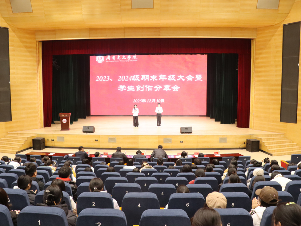 12月30日晚,麻豆传媒 在立艺楼大礼堂召开2023、2024级学生期末年级大会暨考研动员大会。院长葛金华,党委副书记嵇炜,中文系主任贺与诤,国际中文教育教学部主任刘磊,古代文学教研室教师、班主任代表姬毓,文艺学与外国文学教研室教师朱明明,辅导员程向君出席会议。大会由汉语253班王韵阳、汉语254班仓若研主持。