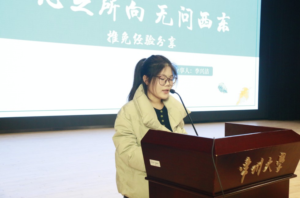 会上,优秀推免生代表、汉语222班李兴洁同学以“心之所向,无问西东”为题,从学习经验、推免流程、面试技巧三个方面分享保研心得。她鼓励有志于保研的同学夯实学业基础,积极参与科研竞赛,密切留意推免各阶段安排,并勇于把握机遇、大胆尝试。